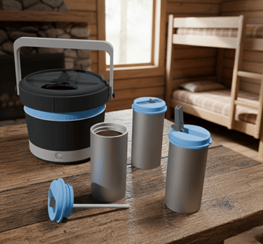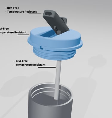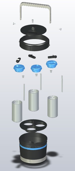 Each and every part of this modular drinking vessel is replaceable (when new replaceable parts of various colors are available in the future). Everything from the individual lids, carrying handle, the chambers, and the body itself.
