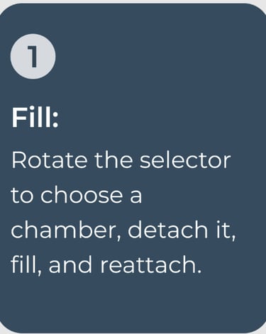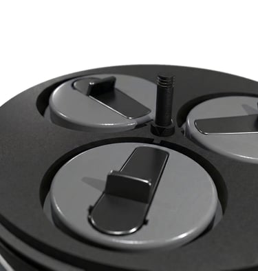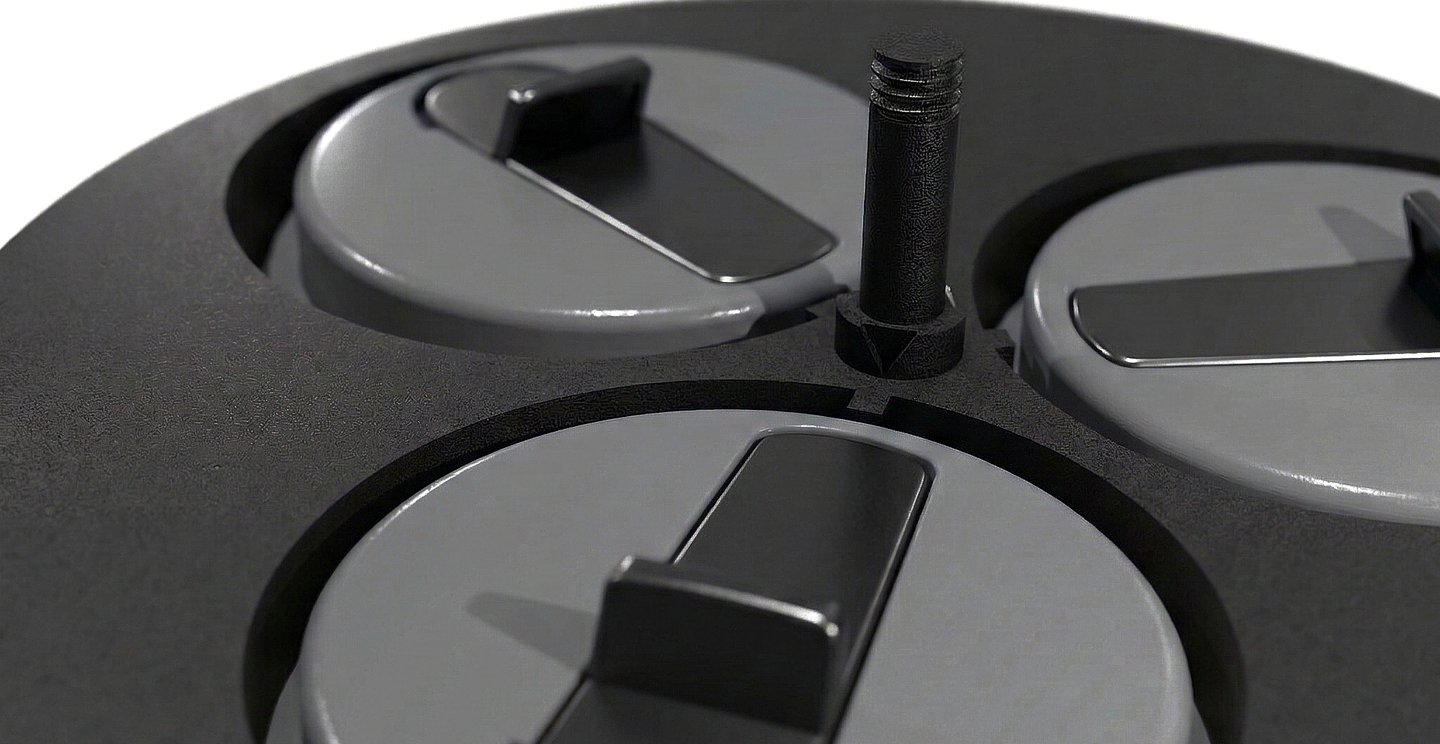 Chamber selection is accomplish by grasping the grip and gently lift and turn to the desired chamber. Releasing the grip will allow the spring loaded selector lid to lock the chamber access opening in place with perfect alignment. The selector plate locks into place with gear-aligned teeth, preventing accidental switching while you walk, lift, or drive.